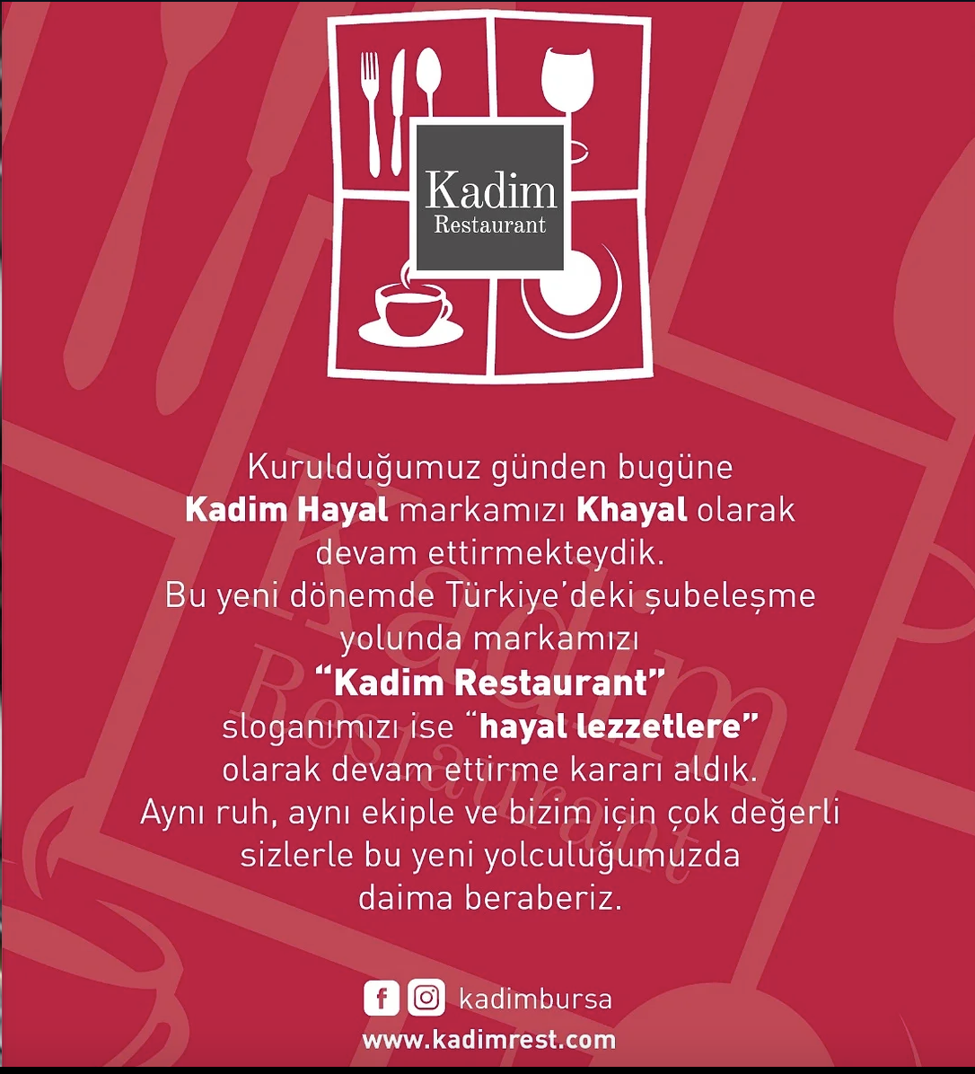 Kurulduğumuz günden bugüne Kadim Hayal markamızı Khayal olarak devam ettirmekteydik , Bu yeni dönemde Türkiye'deki şubeleşme yolunda markamızı "Kadim Restaurant" sloganımız ise "Hayal Lezzetlere" olarak devam ettirme kararı aldık , Bursa restoran,bursa Restaurant,nilüfer restoran,bursa restorant,çamlıca restorant,çamlıca restorant,Restaurant,restoran,kebap,et,mangal,kahvaltı,kasap,köfte,tava,meze,salata,zeytinyağlı,tatlı,künefe,organizasyon,düğün mekanı,kahvaltı,serpme kahvaltı,nilüfer kebap,nilüfer steak,nilüfer et,nilüfer mangal,grup kahvaltı,toplantı mekanı,tandır,bursa tandır,nilüfer tandır,tandır retorant,incik,tütsü et,burger,bursa burger,nilüfer burger,meze,bursa meze,alkolsüz mekan,Adana,Urfa,Beyti,Kuzu Şiş,Beyti Sarma,Steak House,sarma beyti,ali nazik,metrelik kebap,kebap tavuk, bursa en iyi restoran, bursa en iyi restaurant